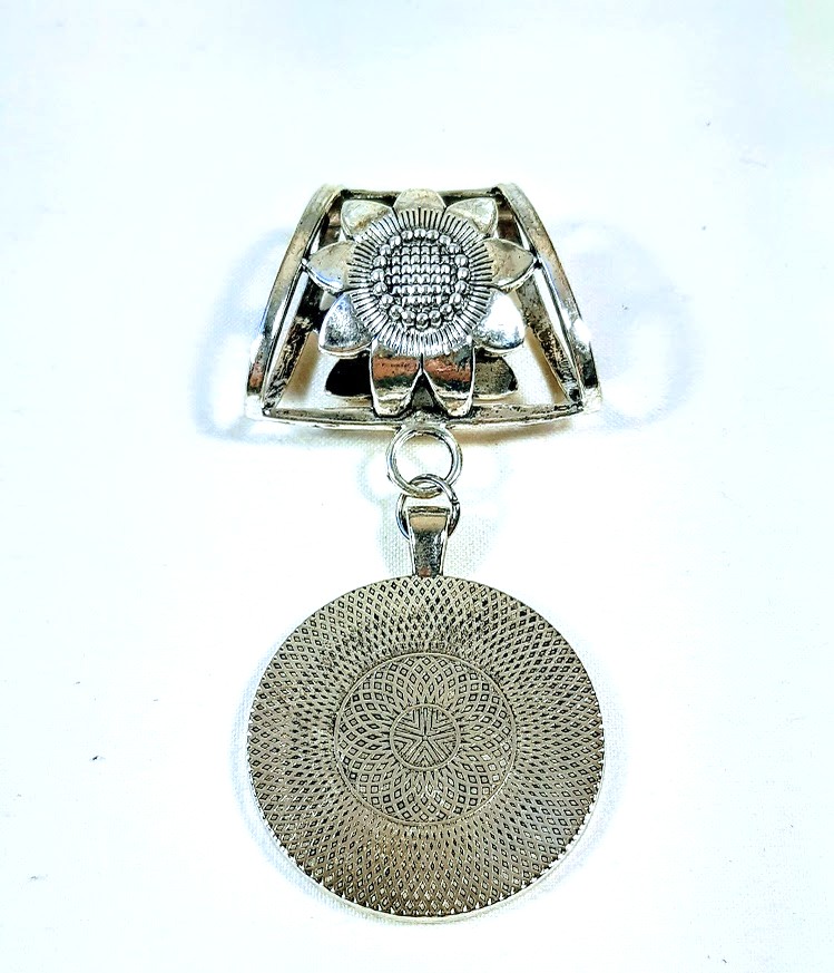 Bijou de foulard en métal couleur argent vieilli, médaillon métal couleur argent vieilli et cuir vachette imprimé, tannage minéral coloris bordeaux.